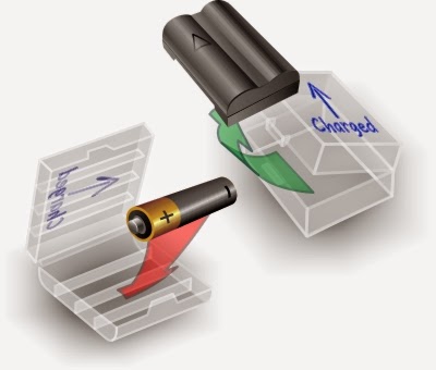In the illustration at right you can see the cases have been labeled with a blue marker. An arrow with the word charged let's you know that if a battery is in the up position the same as the label, that battery is fresh. A battery facing opposite the direction of the label and you have a spent cell.